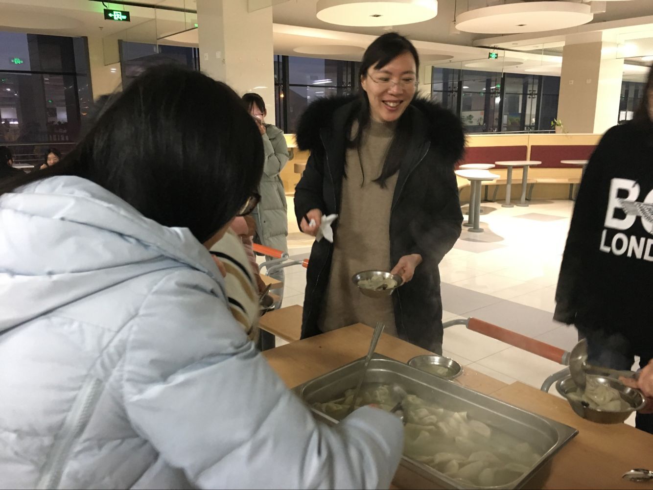 包好的饺子马上送到了食堂工作人员那里,片刻过后热腾腾的饺子呈现在大家面前。同学们拿起碗迫不及待的想品尝到自己亲手做的饺子。虽然饺子有大有小,还有的因为密封不严下水后就煮开了皮,但是并不影响大家吃饺子的快乐。在吃饺子的过程中,老师同学们围坐在一起交流在学校的学习生活感受,其乐融融。