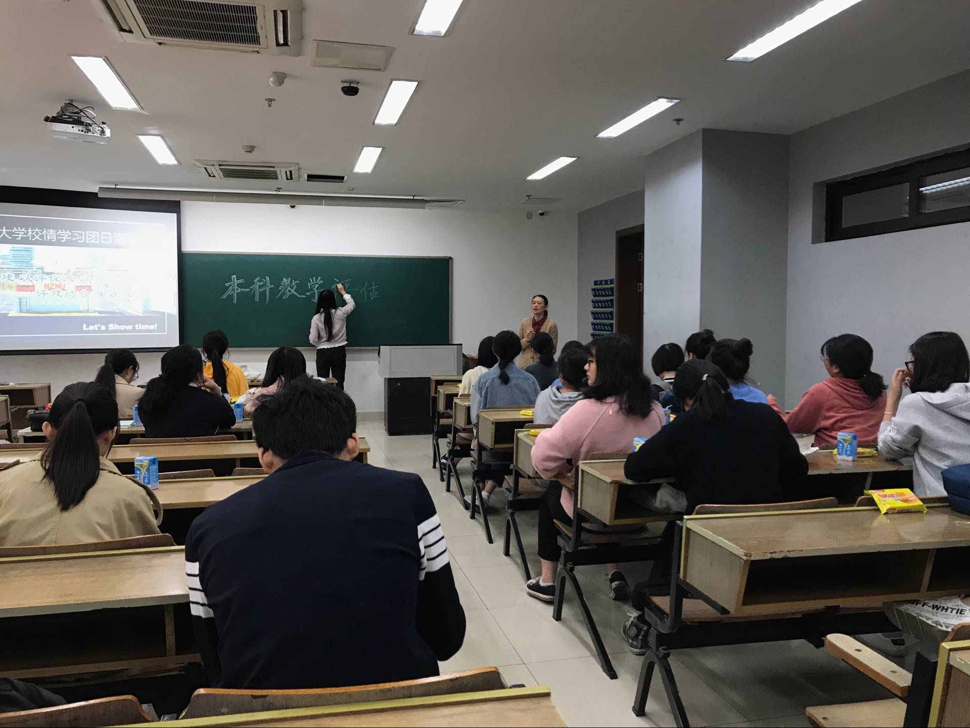 2018年10月29日中午12点15分,中文163班在恕园12-105召开班会。本次班会首先由班主任和班长先后对同学们强调了本科教学评估的重要性,就本科教学评估的一些内容和要求对同学们进行了传达。然后班长就本科教学评估的基本知识给我们做了基本的归纳总结,对其中的重点进行再三强调。而同学们则在班长的带领下仔细学习了本科教学评估的学习手册。同时班长和班主任都对同学们强调上课不能玩手机,要专心听讲,而同学们对此都积极响应,纷纷做出承诺。此次班会使同学们充分认识到了本科教学评估的重要性,并提高了同学们对未来两周本科教学评估的积极性和警惕性。