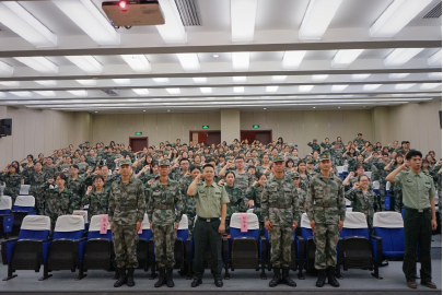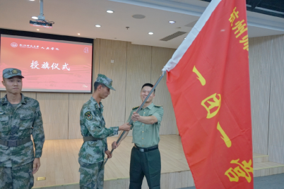 2019级新生代表、来自汉语言文学类193班的杨驰同学代表全体参训新生进行宣誓。动员大会上还举行了授军训旗帜仪式。