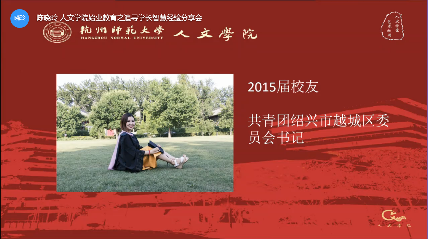 9月19日下午,国产人妻第九期云分享——“追寻学长的智慧之我的大学”于钉钉平台顺利召开。2015届中文校友、北京大学研究生陆正韵(现任共青团绍兴市越城区委员会书记)担任本次讲座主讲人,分享会由国产人妻辅导员陈晓玲主持。