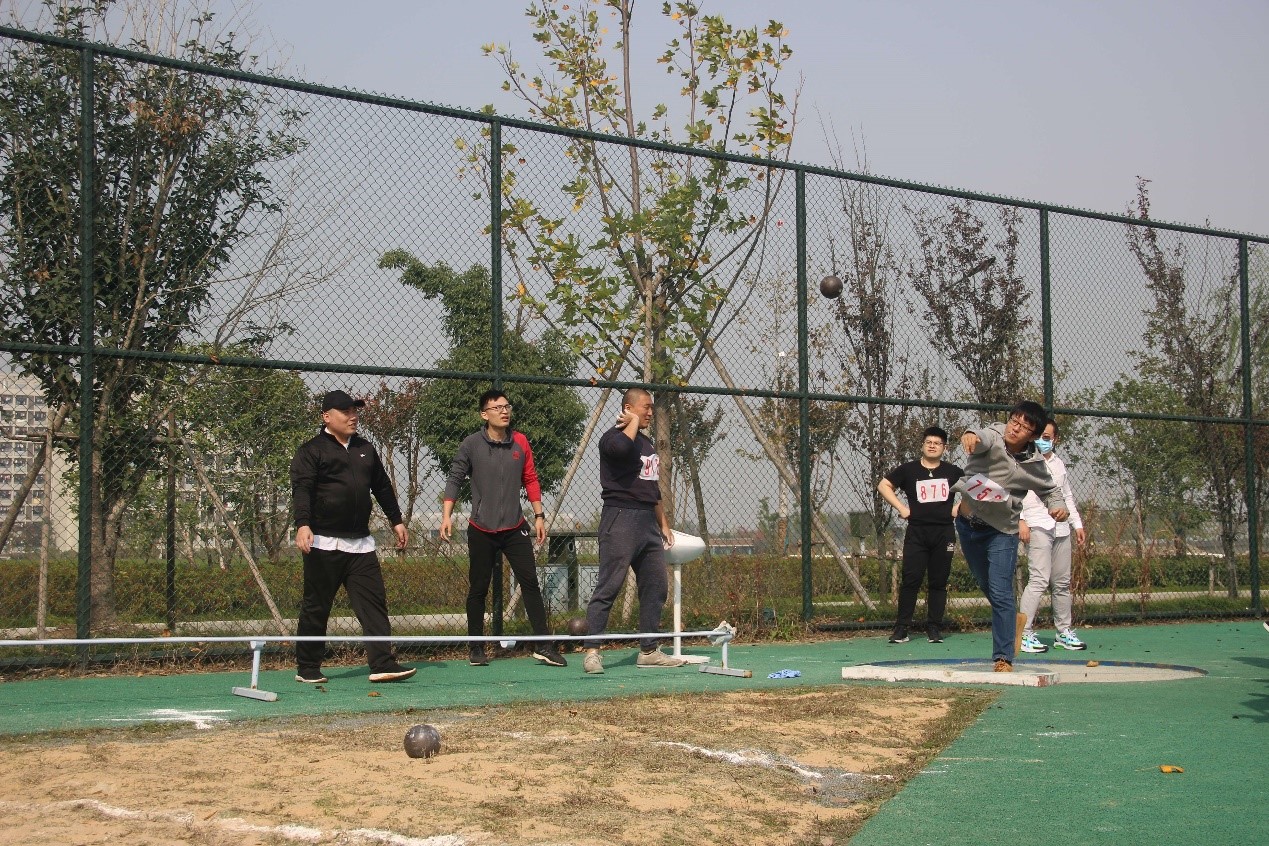 在比赛中,两位老师手握铅球,虽有几分辛苦,但他们淡定从容,汇集全身的力量,奋力投掷。一道道优美的弧线从众人眼前划过,落在竞赛场上,留下精彩的痕迹、努力的结果。