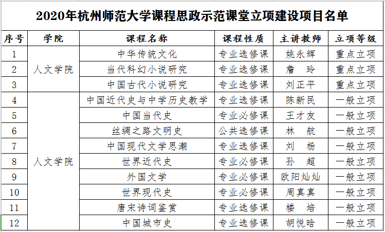 根据《关于开展杭州师范大学“课程思政示范课堂”建设工作的通知》精神,此次立项的项目分为重点项目、一般项目两种类别,项目建设周期一年。建设周期内,课程负责人需要充分挖掘和梳理课程中蕴含的思想政治教育元素,完成课程思政教学设计表。修订课程教学大纲,明确思想政治教育的融入点、教学方法和载体途径,以及如何评价德育渗透的教学成效。在教学资源方面,要使用体现课程思政教育特点的新课件、新教案等。
