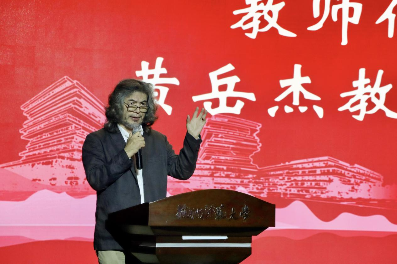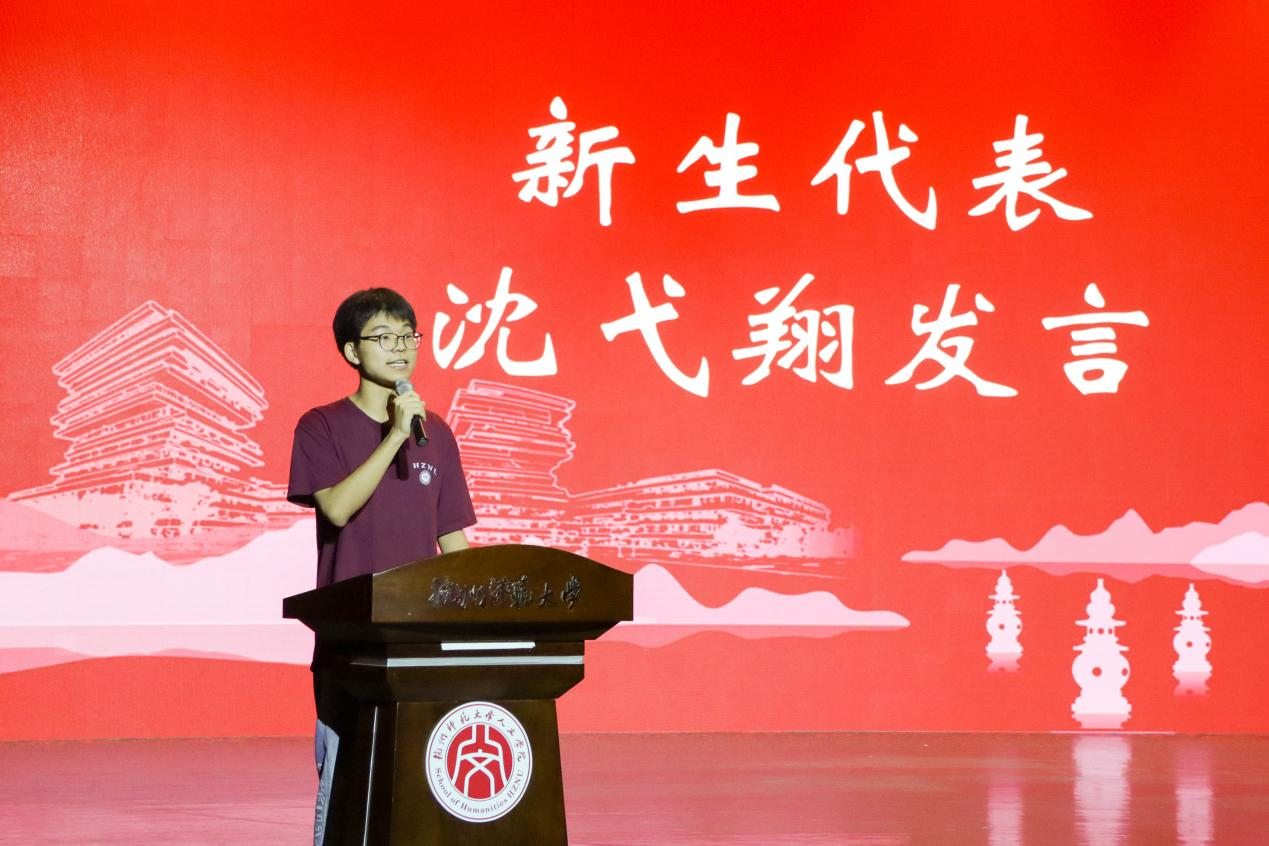 在学生代表发言以后,教师代表黄岳杰和新生们分享了自己的想法。他指出要匀出精力来去思考大学四年的青春时光该怎样度过,去思考一些对人生而言更高更大的命题。他还希望同学们在大学四年中,能够认识大学、认识自己、认识爱和审美的价值,在青春年华为未来的生命打上底色。接下来,大会还举行了新生班主任受聘仪式。院领导为新生班主任颁发聘书,并与他们合影留念。