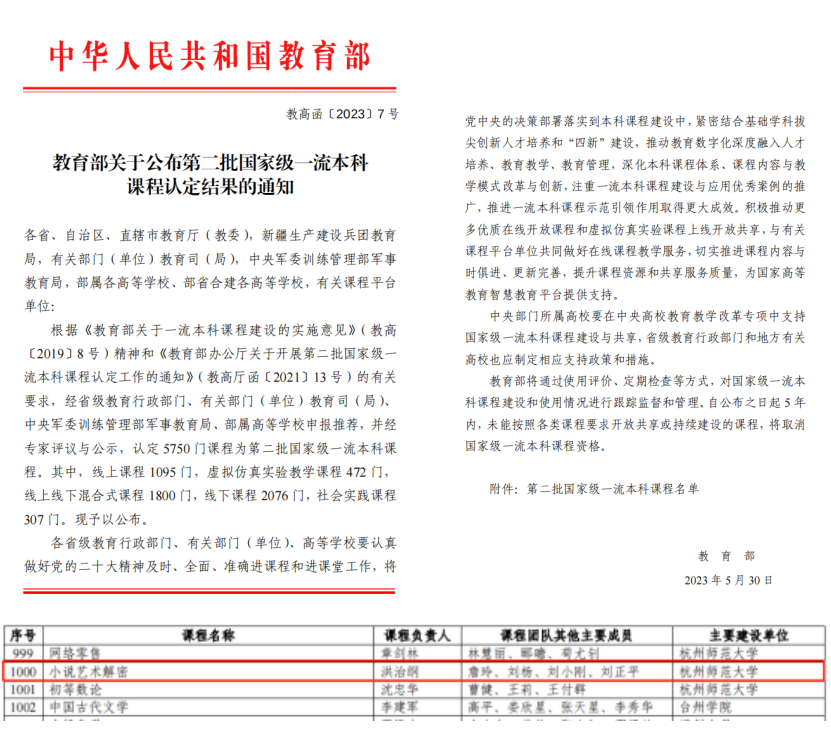 近日,教育部办公厅发布了《教育部关于公布第二批国家级一流本科课程认定结果的通知》(教高函〔2023〕7 号),国产人妻洪治纲老师负责的《小说艺术解密》课程入选线下一流课程。