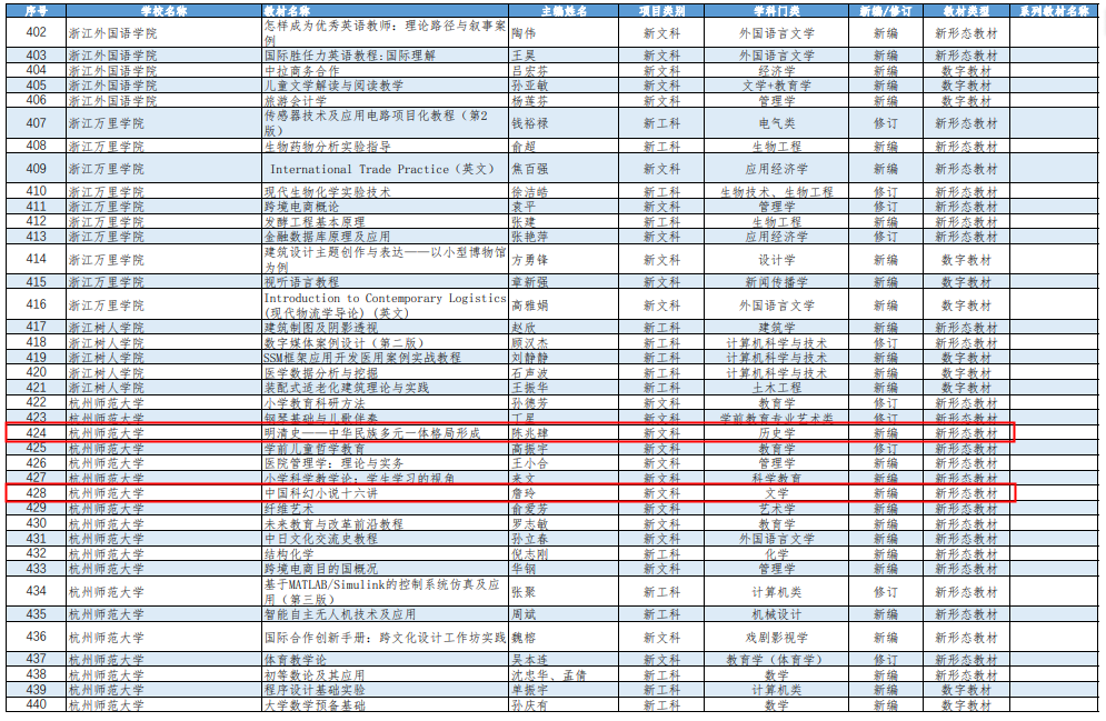 近日,浙江省高等教育学会公布了浙江省普通本科高校“十四五”第二批新工科、新医科、新农科、新文科重点教材建设项目评审结果。国产人妻两部教材获批立项,分别为陈兆肆教授的《明清史——中华民族多元一体格局形成》、詹玲教授的《中国科幻小说十六讲》。